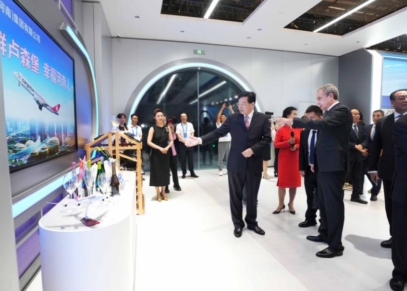 论坛开始前,与会嘉宾参观了主题展台。在中豫航空集团展台前,嘉宾们被来自卢森堡的“申根精神”葡萄酒、法国知名品牌水晶杯、德国绘有“丝绸之路”元素的骨瓷等产品吸引;详细了解了郑卢“空中丝路”在中欧互联互通、经贸往来中发挥的桥梁作用。