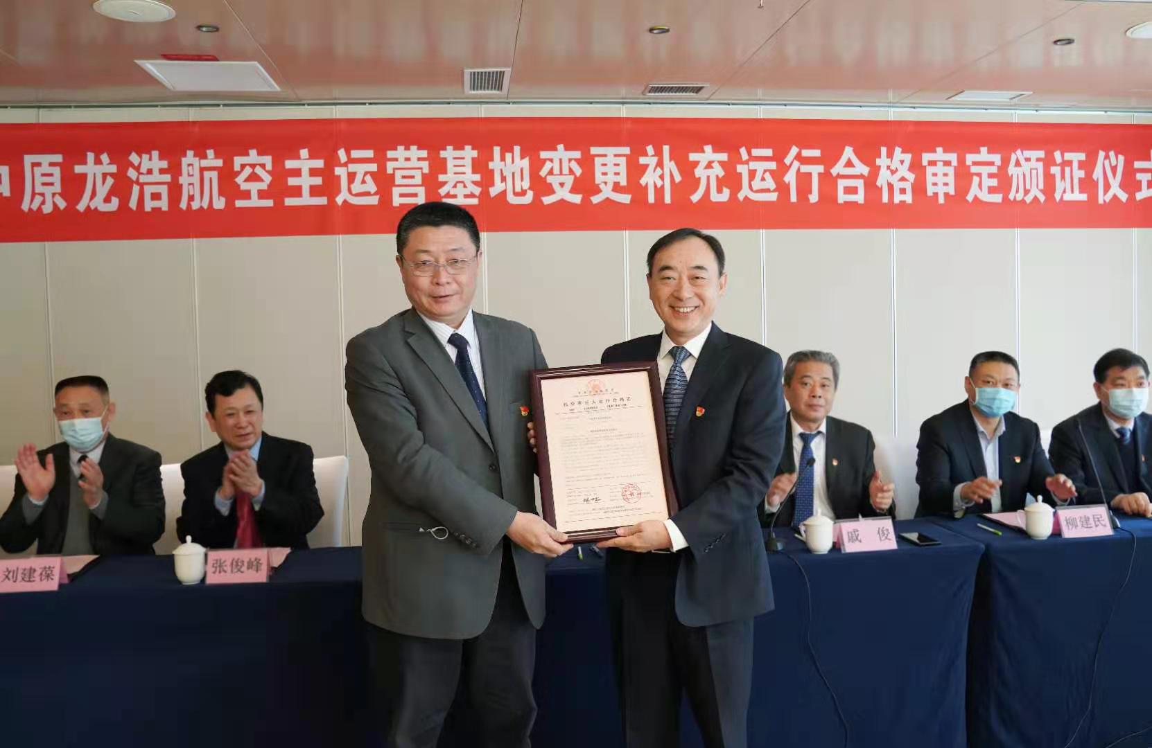 3月4日上午,民航中南地区管理局局长马兵在郑州向中原龙浩航空有限公司颁发了《航空承运人运行合格证》,这标志着中原龙浩的主运营基地由广州变更至郑州新郑国际机场,进入了郑州广州“双基地”协同联动、充分运营的新阶段。河南省财政厅党组成员、副厅长赵庆业与马兵共同参加颁证仪式并致辞,民航河南监督管理局局长戚俊主持仪式。颁证结束后,马兵等参观了中原龙浩AOC运行控制大厅。