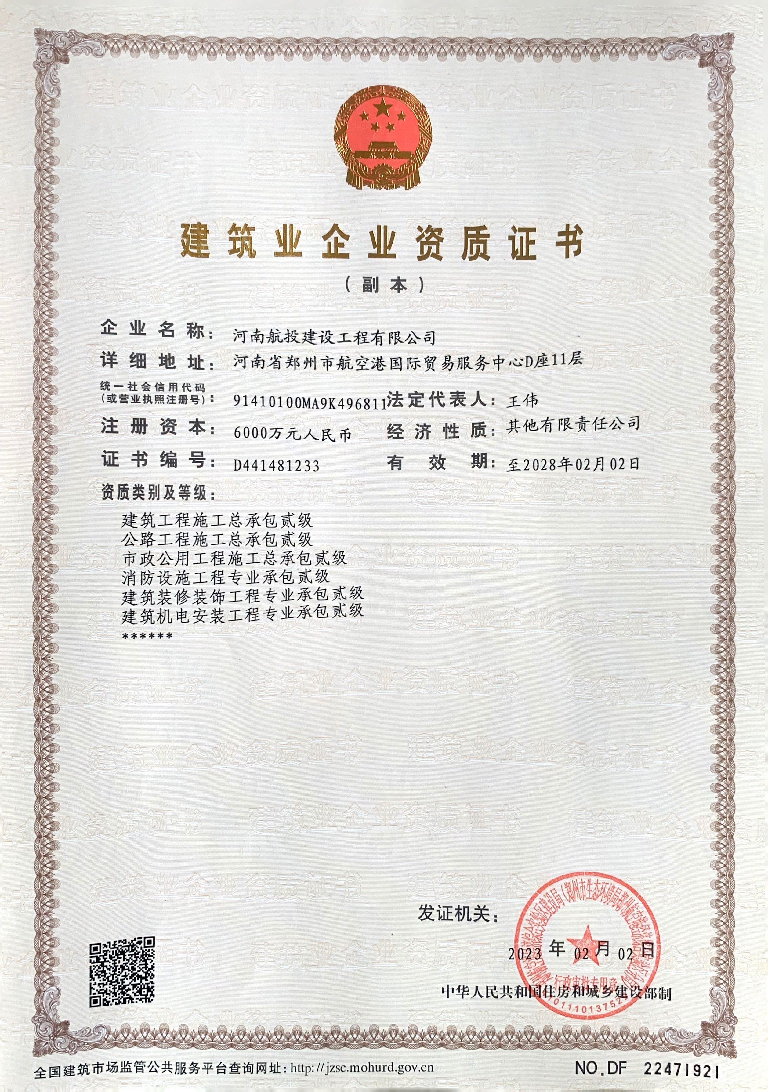 2月3日,河南航投建设工程有限公司(以下简称航投建工)取得施工总承包及多项专业资质,全面满足建筑业市场准入及承揽机场建设、民用、市政及公路等相关业务条件,成为河南首家民航机场专业化国有施工企业。